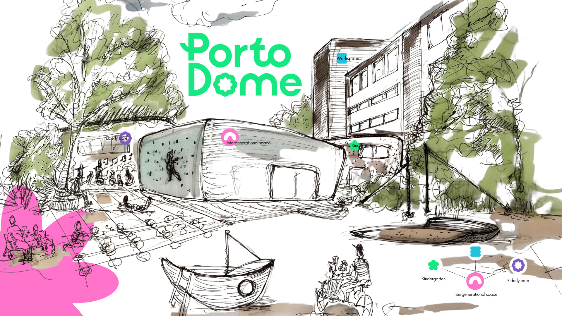 Porto Dome experiments with another spatial logic: a workplace embedded within an intergenerational ecosystem, where learning, caregiving, and professional life intersect.